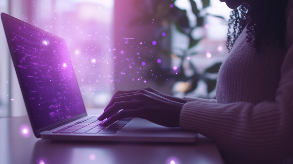 Prompti: ”Luo kuva modernista kahvilasta, jossa näkyy lämmin tunnelma ja brändin värit (luumunvioletti ja luonnonvalkoinen).”